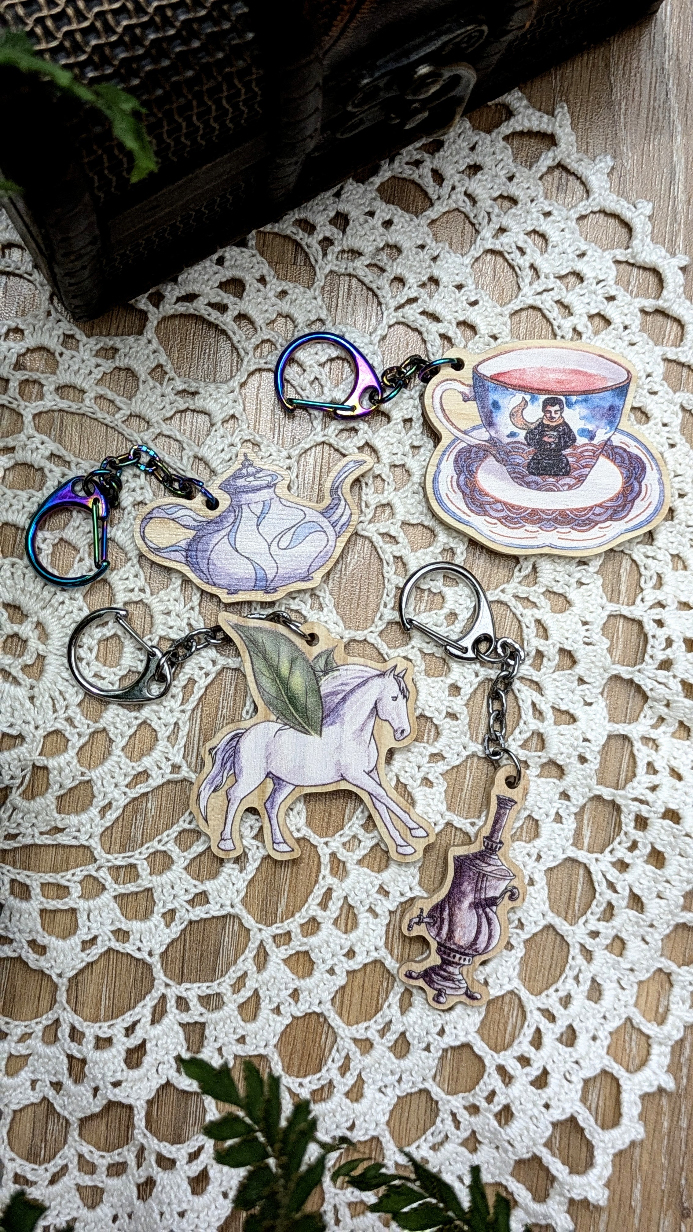 • Les chaînes de la tasse et de la théière sont en métal irisé violet